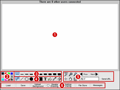 | Click on a button to activate that function: Load - allows you to load a previously saved picture, or a jpeg/png background image. Save - allows you to save the current picture. If the filename you enter ends with ".jpg", ".jpeg" or ".png", the picture will be saved as a jpeg or png file. Otherwise it is saved in a custom vector format. Upload Background - allows you to upload jpeg or png images which can then be set as backgrounds. Note that this button is only displayed if you have upload permission. Disable Drawing - click this button to prevent any other users from drawing onto the whiteboard. Note that this button is only displayed if you have "disable interaction" permission. When you click this button, a window appears showing who can draw. You can click on a user's name to allow only that user to draw. Desktop Sharing (optional) - clicking this button enables the desktop sharing function. Your computer desktop image will be sent to the other users in real-time, allowing you to demonstrate applications. The other users will just be able to view your desktop and your mouse pointer; they will not have any control over your desktop or your computer. The Desktop Sharing button only appears if the show_deskshare option has been set to true in the options file for the whiteboard. File Store (optional) - clicking this button brings up a file store, allowing you to upload and download files. This button only appears if the show_filestore option has been set to true in the options file for the whiteboard. Messages (optional) - clicking this button brings up a bulletin board, allowing you to read and post messages. This button only appears if the show_msgboard option has been set to true in the options file for the whiteboard. Chat (optional) - clicking this button brings up a chat window, allowing you to chat to other users. This button only appears if the show_chat option has been set to true in the options file for the whiteboard. Record (optional) - clicking this button starts recording the session. Ths button only appears if the show_record option has been set to true in the options file for the whiteboard. | |