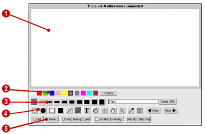 | Click on a button to activate that function: Load - allows you to load a previously saved picture, or a jpeg/png background image. Save - allows you to save the current picture. If the filename you enter ends with ".jpg", ".jpeg" or ".png", the picture will be saved as a jpeg or png file. Otherwise it is saved in a custom vector format. Upload Document - allows you to upload a document (.doc, .xls, .ppt or .pdf) or image (.gif, .png, .jpg or .tiff). After uploading, you can load the document by using the Load button. Note that the Upload Document button is only displayed if you have upload permission. Voiceconf - click this button to begin a voice-over-ip conferencing session, allowing you to speak to the other users in the conference using your microphone (NOTE: it is recommended that all users have headsets). Disable Drawing - click this button to prevent any other users from drawing onto the whiteboard. Note that this button is only displayed if you have "disable interaction" permission. Desktop Sharing (optional) - clicking this button enables the desktop sharing function. Your computer desktop image will be sent to the other users in real-time, allowing you to demonstrate applications. The other users will just be able to view your desktop and your mouse pointer; they will not have any control over your desktop or your computer. The Desktop Sharing button only appears if the show_deskshare option has been set to true in the options file for the whiteboard. | |